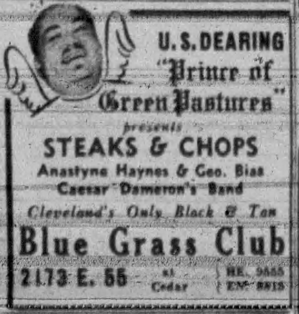 As a result, Dearing left the Steel City for the Forest City in 1932. According to a story he told often, Dearing arrived in Cleveland with 97 or 98 cents in his pocket, which he said he threw on the sidewalk after getting off the bus at East 107th Street and Euclid Avenue because he decided someone else might need it more than he. Over the next two years, Dearing worked as a short-order cook before eventually landing a job as the manager of the popular, Green Book–listed Cedar Gardens restaurant at 9706 Cedar, a Harlem-inspired “black and tan” club where jazz music brought the races together. There he earned the nickname “Prince of Green Pastures” because Cedar Gardens was the pulsing heart of an emerging upscale Black nightlife district that assumed this name upon the death in 1935 of Black actor Richard B. Harrison, beloved for his starring role in the Broadway hit Green Pastures.
