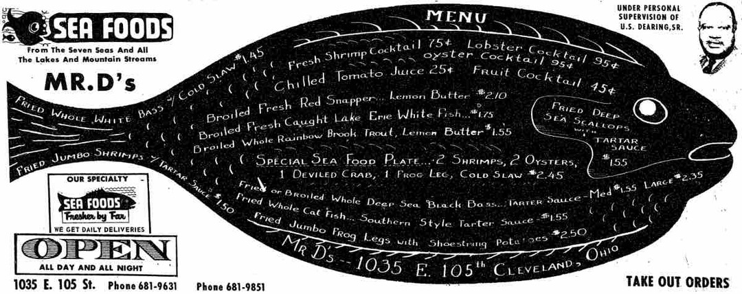 The Glenville-based Dearing’s enjoyed a long run, proving so successful that Dearing began to expand with the assistance of his son U. S. Dearing Jr. In 1956, he opened Dearing’s Carry-Out Store, whose slogan was, “Your apartment is your dining room.” Between 1960 and 1970, Dearing’s added five additional locations: Dearing’s Chic-A-Rib Room (1960), later named Dearing’s Living Room Lounge, Mark I Lounge, Second Choice Lounge, and finally the Candlelight Room, in the former Gem Snack Bar & Bar-B-Q at 10932 Superior Avenue; Dearing’s Carry-Out (1963) at 12019 Ashbury Avenue; Dearing’s Continental Lounge (1968) at 12804 St. Clair Avenue; Dearing’s Party Center (1969) at 17324 Harvard Avenue; and finally Dearing’s Catering (1970), later known as the Mark III Lounge and Carry-Out, at 11223 St. Clair.