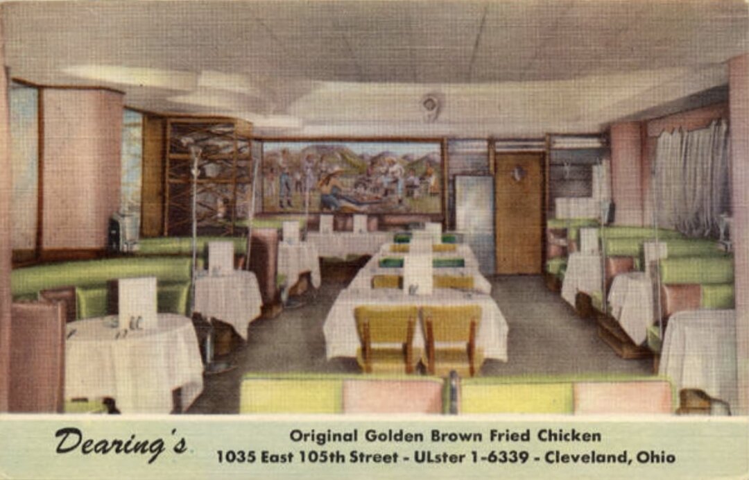 Open 24 hours a day, Dearing’s flagship restaurant was known not only for its unforgettable fried chicken but also for its sumptuous Sunday dinners. One Sunday menu in 1953, for instance, included thirteen entree options — Roast Prime Rib of Beef Au Jus, Roast Young Hen Turkey with Gravy and Cranberry Sauce, Roast Loin of Pork with Candied Yams, Broiled Boston Lamb Chops on Toast Points, Baked Sugar-cured Ham with Fresh Fruit Sauce, Stewed Fresh Country Chicken Dublin Style, Roast Long Island Duckling with Stewed Apples, Sauce Baby Chicken Livers in Butter on Toast, Broiled Prime Boston Strip Steak with Mushrooms, Lobster a la Newburgh in Casserole, Saute Veal Sweet Breads with Fresh Mushrooms, Broiled Fresh Caught Lake Erie White Fish Maitre D’Hotel, Broiled Fresh Caught Red Snapper with Lemon Butter, and Fried Jumbo Frog Leg with Tartar Sauce — all modestly priced between $1.25 and $2.25.